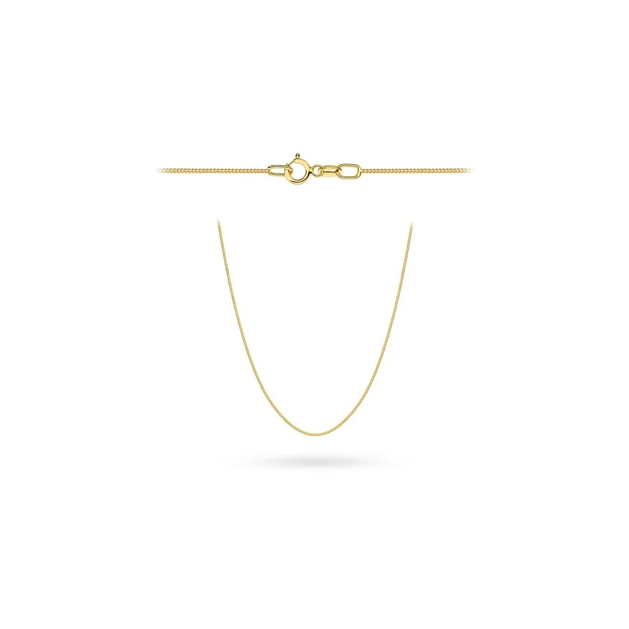 Precyzyjnie wykonany złoty łańcuszek próby 585. Splot pancerka gładka. szerokość łańcuszka wynosi ok 0,65mm.