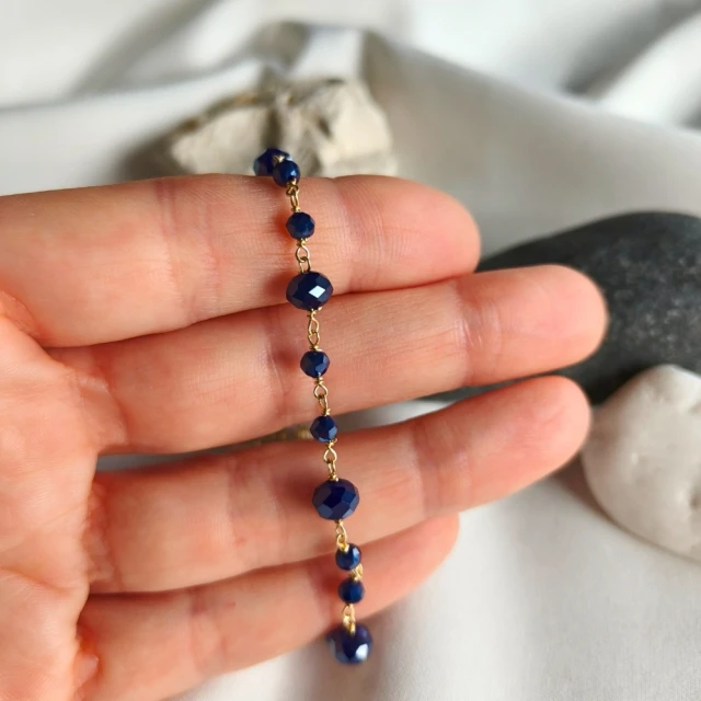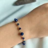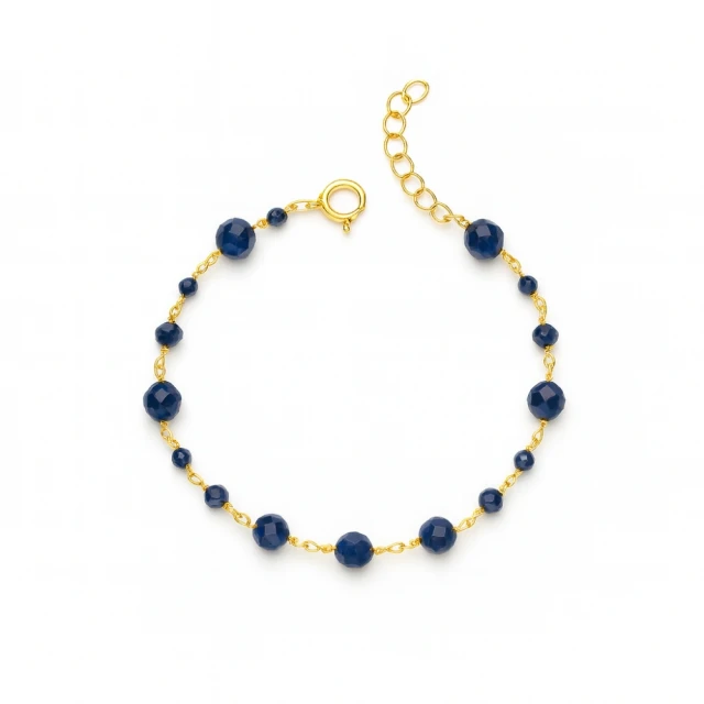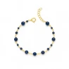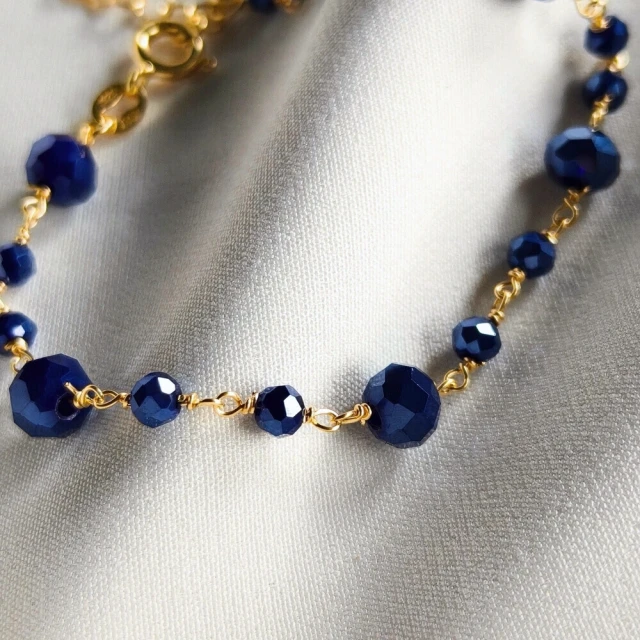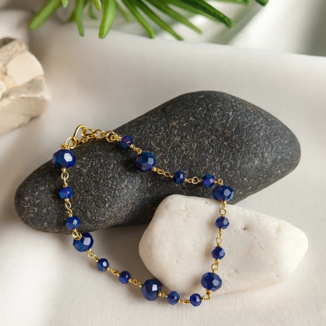 Bransoletka srebrna próby 925, pozłacana złotem 585, zachwyca elegancją i subtelnym blaskiem. Ozdobiona fasetowanymi koralikami w głębokim, szafirowym kolorze, pięknie mieni się w świetle, dodając szyku każdej stylizacji. To wyjątkowy dodatek, łączący klasykę srebra ze szlachetnym akcentem złota i koloru kamieni.