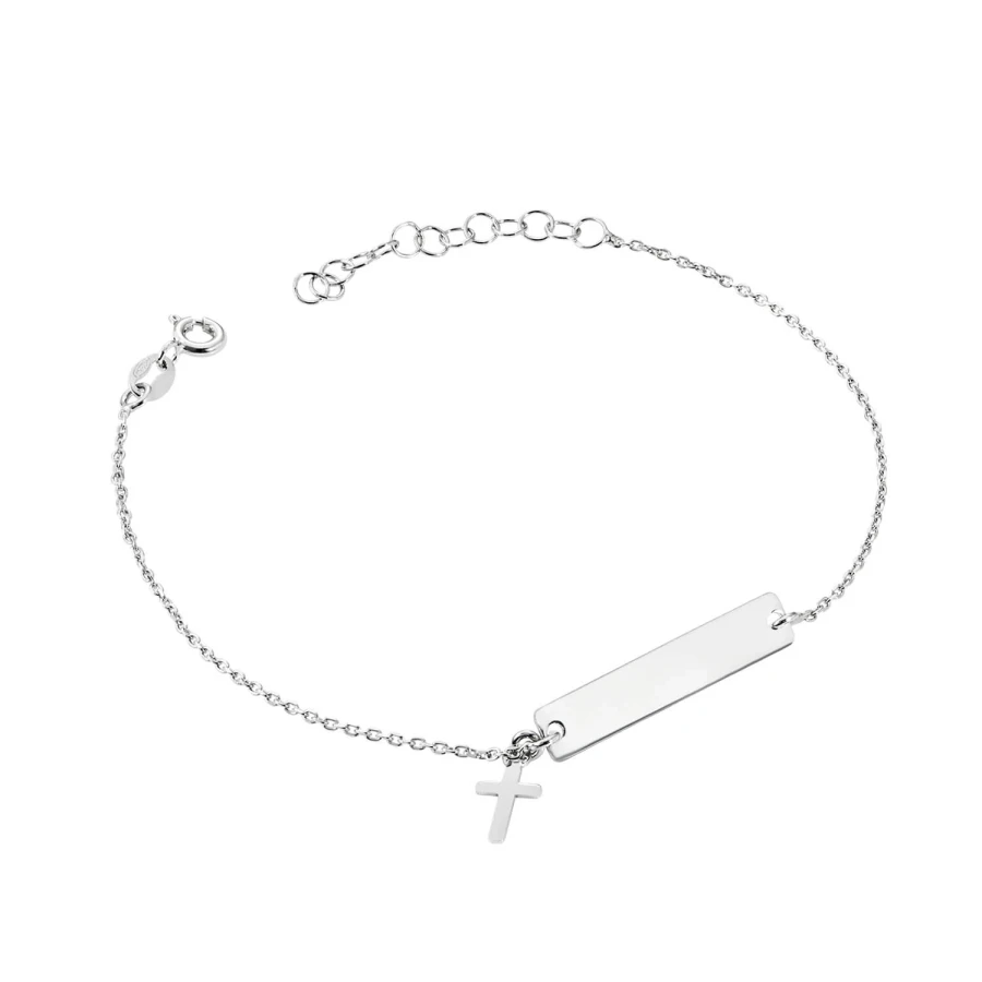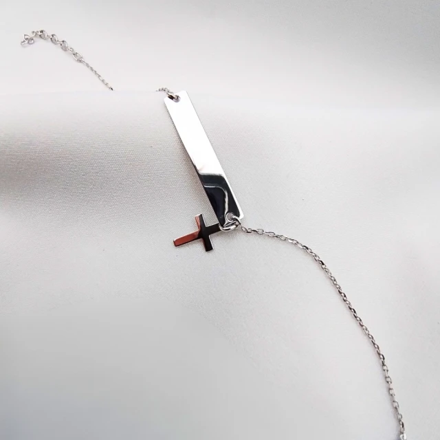 Delikatna bardzo prosta srebrna rodowana bransoletka. Ozdobiona została blaszką z małym krzyżykiem. Doskonała okazja na obdarowanie kogoś bliskiego. Istnieje możliwość umieszczenia napisu z obu stron blaszki.