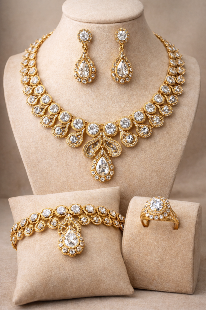 Jeszcze kilka lat temu popularne były komplety biżuterii składające się z naszyjnika, kolczyków, bransoletki i pierścionka w identycznym stylu. Obecnie takie zestawy pojawiają się coraz rzadziej.