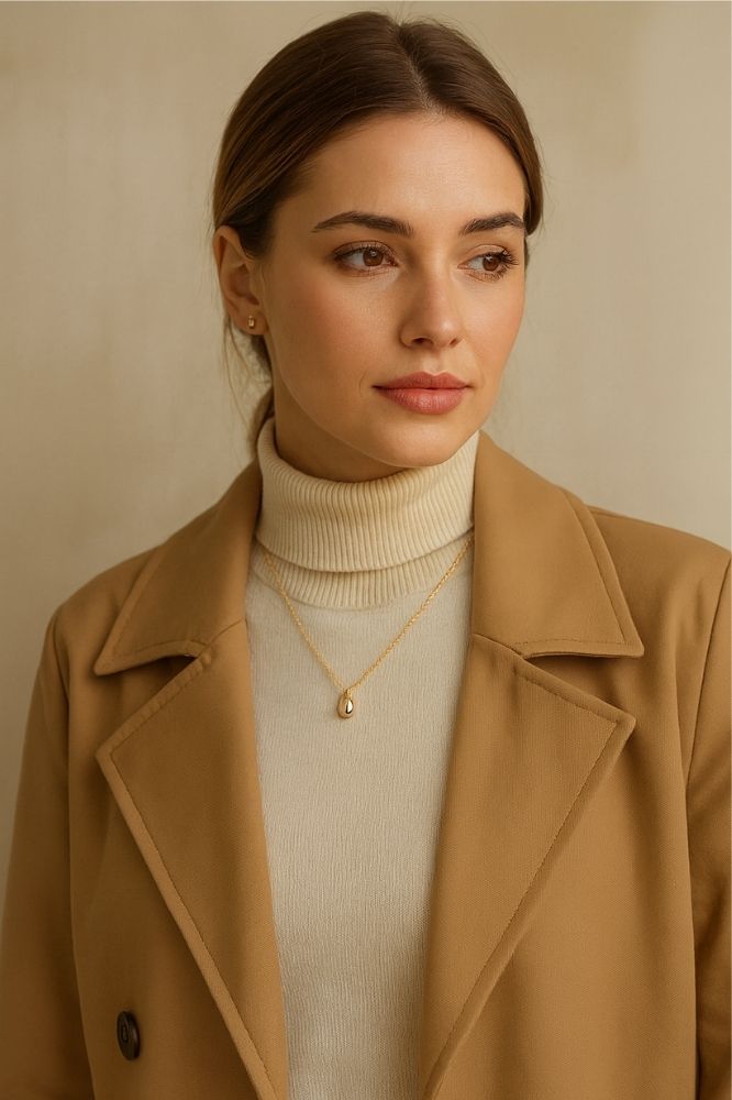 Klasyka, która nigdy nie wychodzi z mody. Camelowy trencz, gładki beżowy golf i delikatny makijaż to zestaw, który zawsze wygląda nienagannie. Idealnym dopełnieniem będzie długi naszyjnik z dekoracyjnym akcentem czy złoty pierścionek z cyrkonią w kolorze owocu granatu – subtelny, ale wyrazisty akcent, który doda stylizacji ciepła i charakteru. Jego rubinowo-burgundowy odcień pięknie kontrastuje z jasnymi tkaninami, podkreślając profesjonalizm z nutą kobiecości.