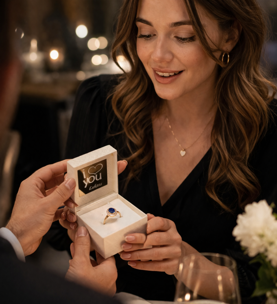 W ergold.pl oferujemy grawer gratis – na opakowaniu (blaszka okolicznościowa) lub w biżuterii, jeśli jest miejsce. Dla pierścionków powyżej 300 zł grawer wykonujemy w środku pierścionka za darmo. Możemy wygrawerować datę, imiona, specjalne życzenia – ogranicza nas tylko wyobraźnia. Dzięki temu Twój prezent stanie się jedyny w swoim rodzaju i zyska wartość pamiątki.