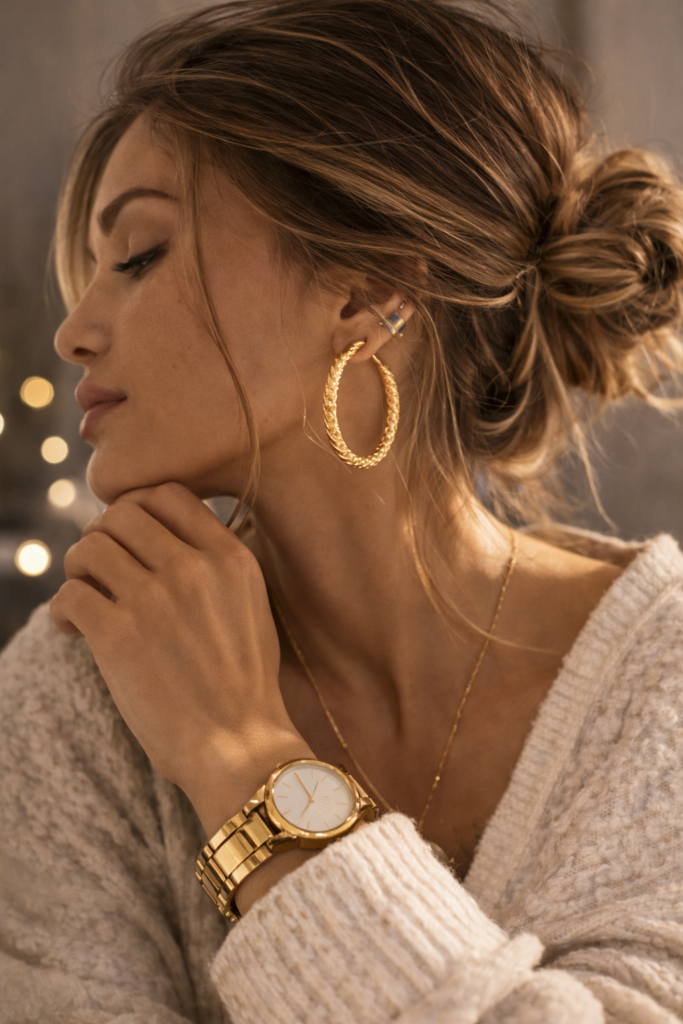 Duże złote kolczyki w formie kół, geometrycznych kształtów lub artystycznych projektów mogą stać się centralnym elementem stylizacji. Takie dodatki doskonale sprawdzają się podczas specjalnych okazji, ale coraz częściej są także noszone na co dzień jako element podkreślający indywidualny styl.