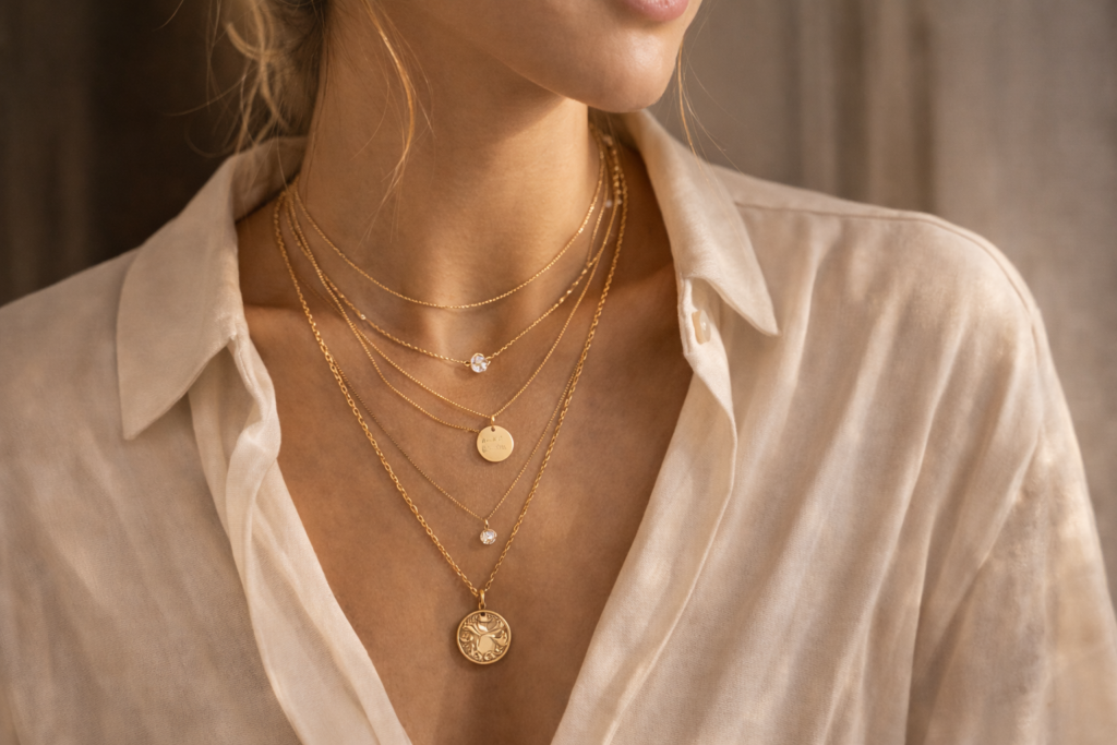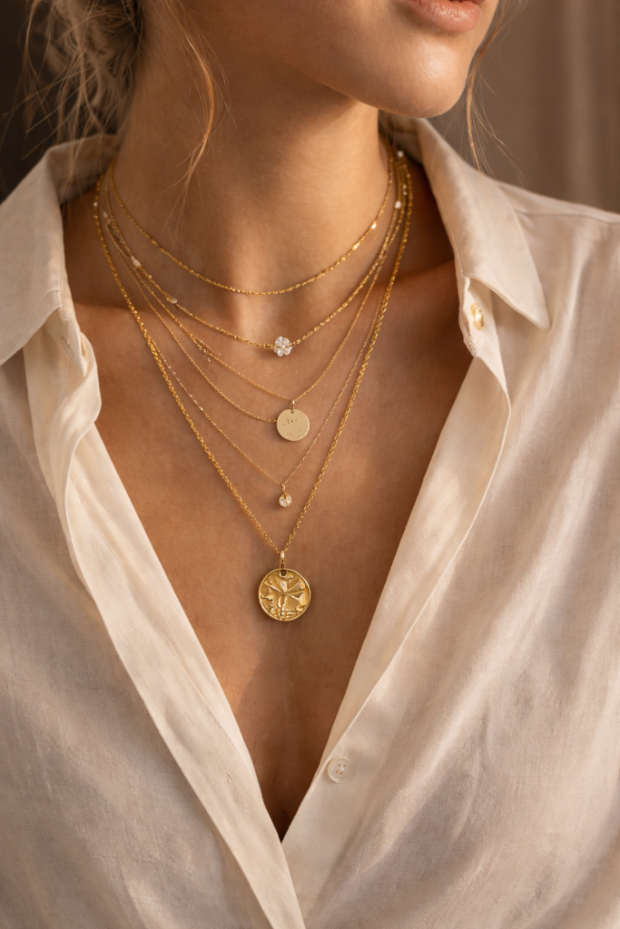 Warstwowanie pozwala stworzyć stylizację, która wygląda naturalnie i modnie, a jednocześnie jest bardzo indywidualna. Można łączyć ze sobą różne style biżuterii – od klasycznych łańcuszków po bardziej ozdobne zawieszki.