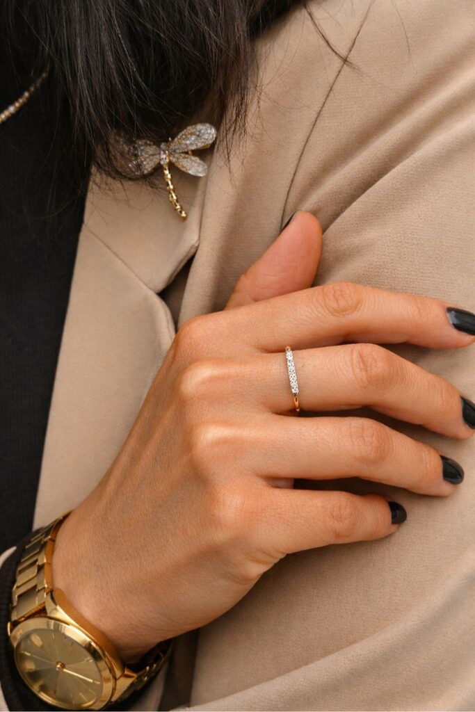 Kolejnym mocnym trendem jest warstwowanie złotej biżuterii, czyli noszenie kilku elementów jednocześnie. Szczególnie popularne stało się łączenie kilku naszyjników o różnych długościach lub zestawianie kilku pierścionków na jednej dłoni.