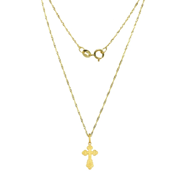Schönes goldenes orthodoxes Kreuz. Das Kreuz wurde in Form eines kleinen Anhängers gestaltet. Es ist ein Schmuck von heiliger Natur. Kann mit einer empfindlichen Kette mit Singapur-Gewebe vervollständigt werden.